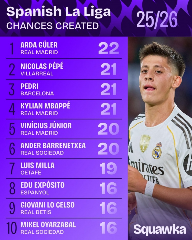 西甲创造机会次数排行:居勒尔22次居首 佩德里、姆巴佩并列第二
