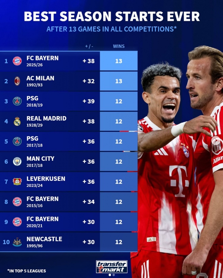 德转列五大职业联赛 球队赛季前13场最佳开局:拜仁&92年米兰并列居首