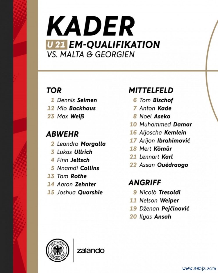 11月7日讯 德国U21公布新一期球员名单,卡尔、比朔夫、小伊布在列,苏超在线直播高清视频无插件德国U21将在U21欧洲杯预选赛中对阵马耳他U21、格鲁吉亚U21。