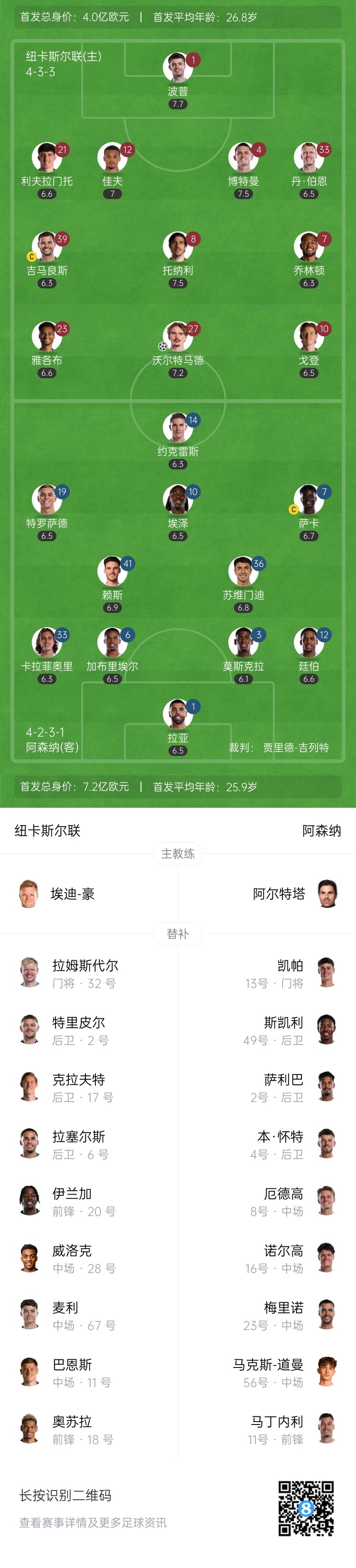 第34分钟,托纳利底线球协作 ,随后右脚再往危险区域 内传中,危险区域 内沃尔特马德顶球破门!纽卡1-0领跑 阿森纳↓