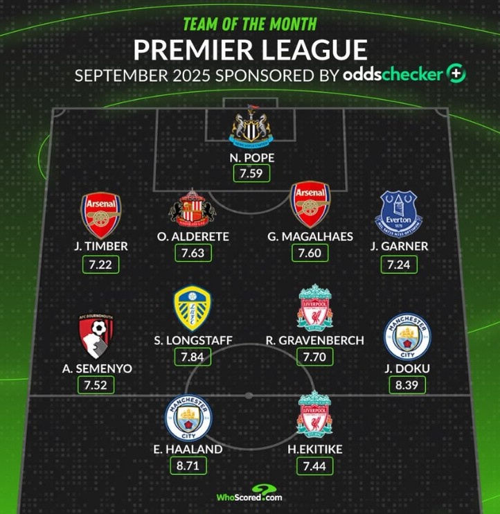 Whoscored评英超9月最佳阵:哈兰德、埃基蒂克、加布里埃尔在列