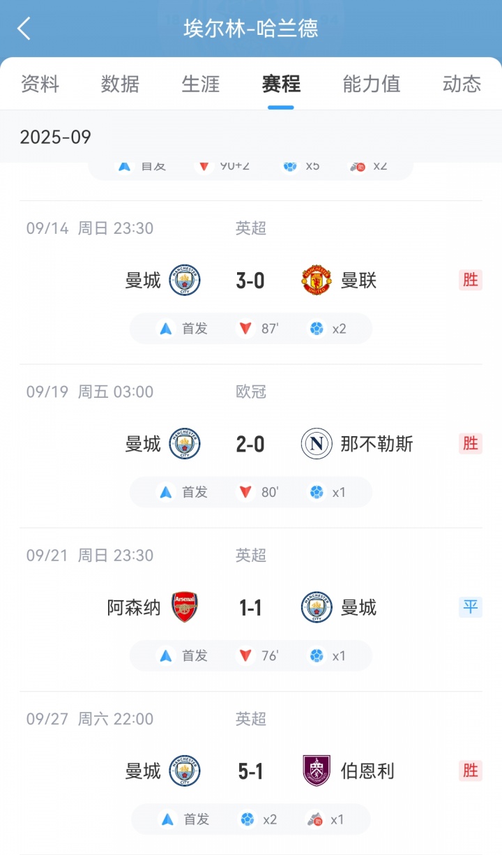 哈兰德(曼城):出场3次,5球1助功 ,成功对峙 8次,5次射正