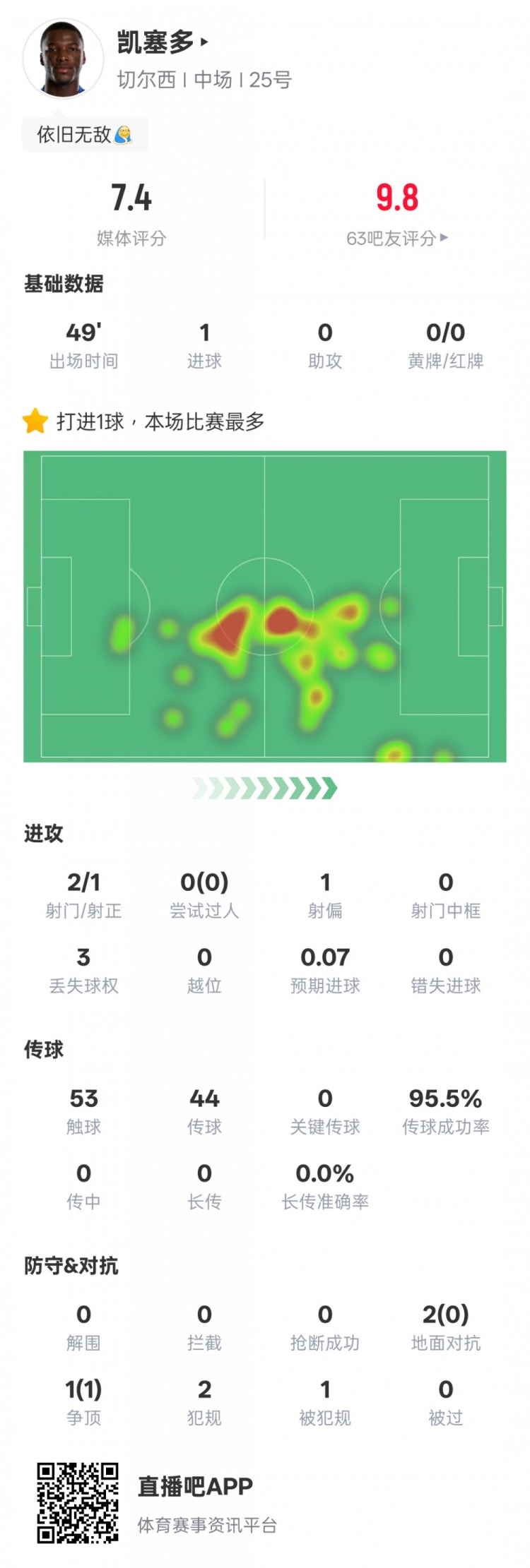凯塞多本场赛事 数据:1射正1得分 +传送球 成功率95.5%,评分7.4