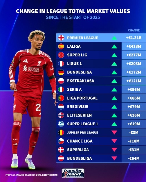10月25日讯 德国转会市场统计了欧洲各职业联赛 2025年球员总身价的变化,并列出榜单,苏超直播在线观看英超增加13.1亿欧最多,西甲增加4.18亿欧次席。