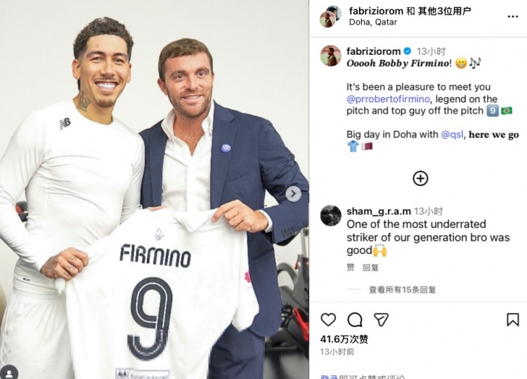 10月31日讯 转会名记罗马诺更新社媒,晒出自己现身卡塔尔看赛事 的动态,并晒出了和菲尔米诺手持运动活动 服 的合影,后者目前在卡塔尔萨德俱乐部效力。