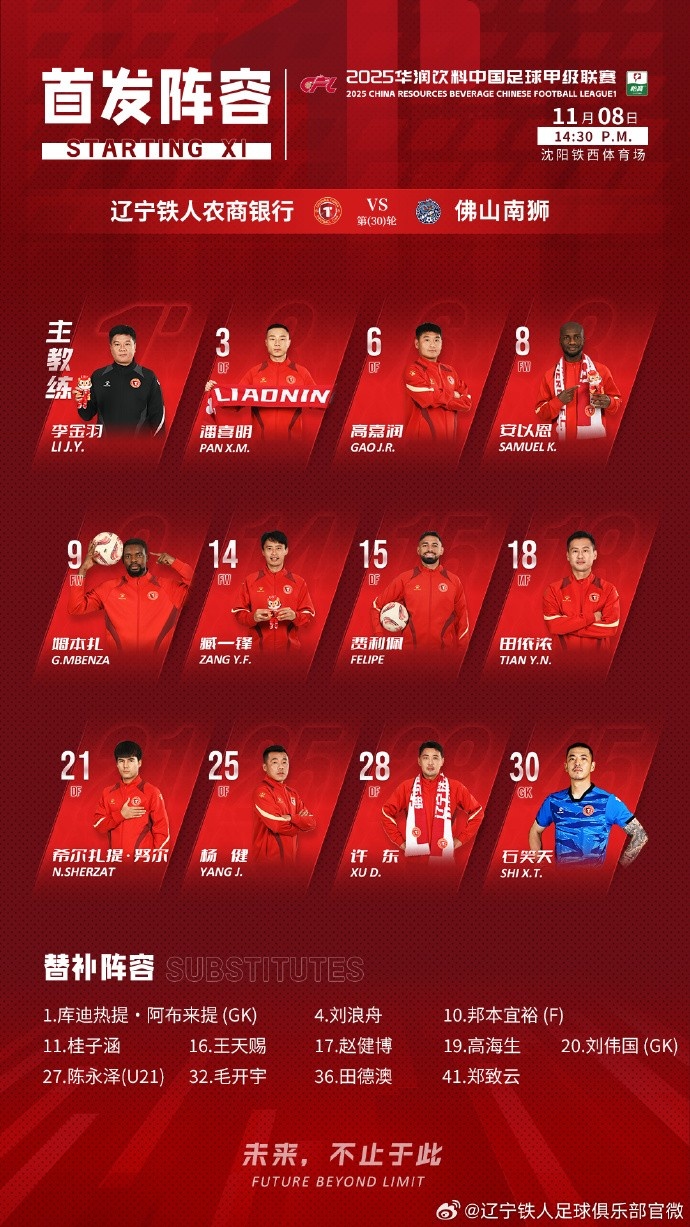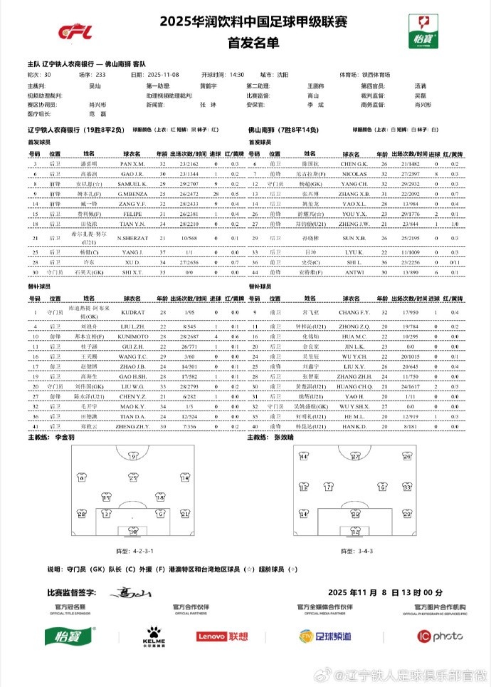 中甲第30轮,辽宁铁人vs佛山南狮杆位出炉