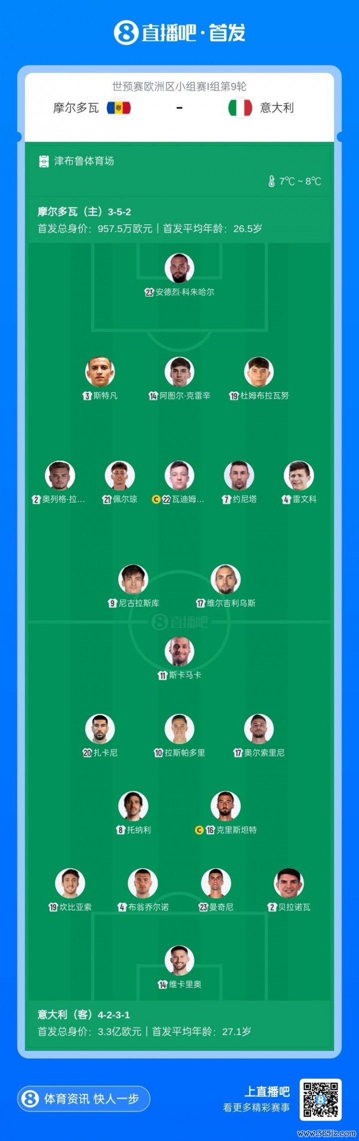 11月14日讯 世预赛欧洲区小组赛I组第9轮,摩尔多瓦主场作战 迎战意大利,苏超在线直播高清视频无插件赛前杆位名单公布。